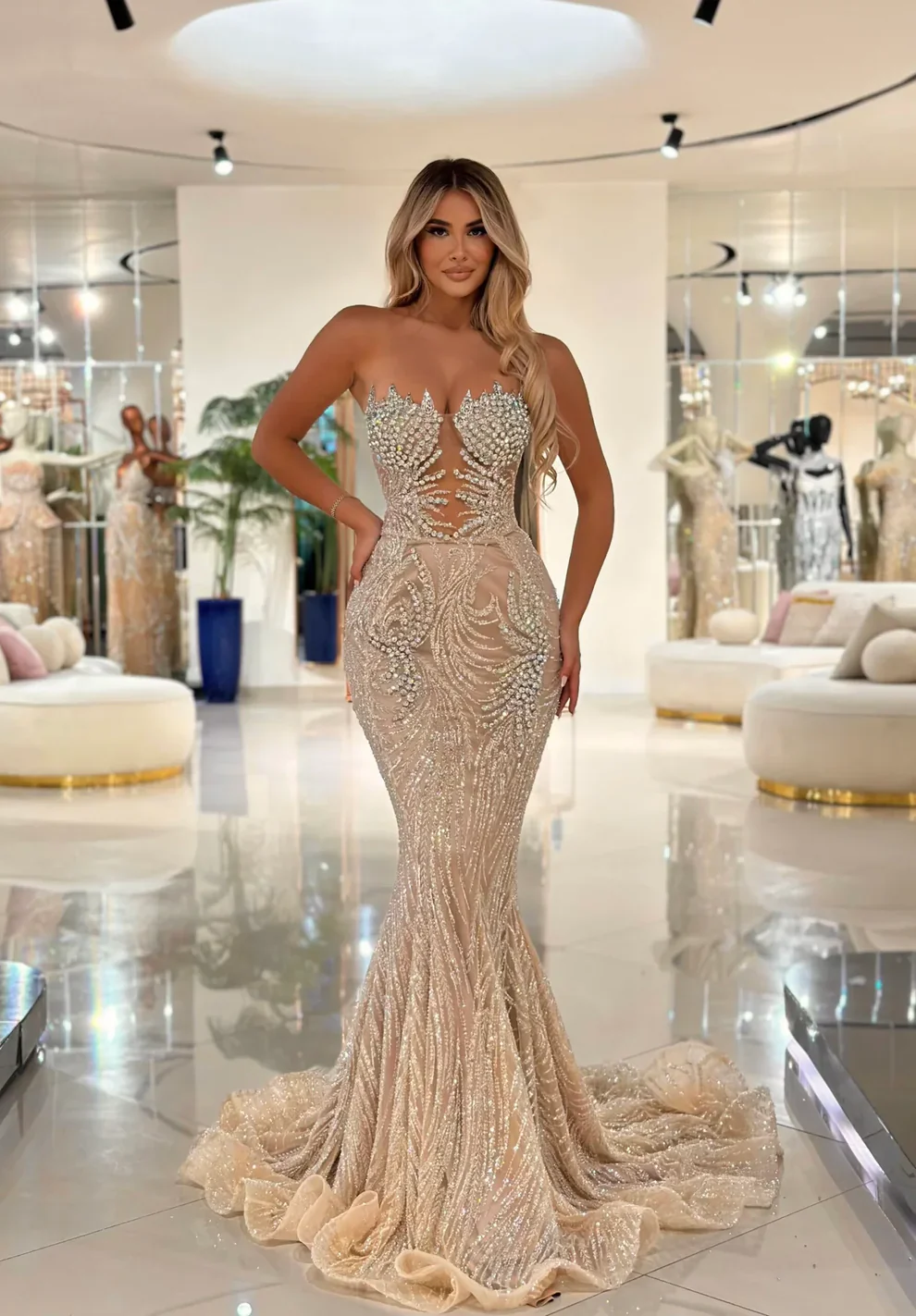Our "Mayra" dress is a stunning, floor-length dress, designed with stones and sparkling embellishments. The strapless, sweetheart neckline is adorned with shimmering crystals that go down, creating a glamorous and elegant look. The dress flares out slightly at the bottom into a dramatic mermaid tail, accentuated with delicate, flowing fabric that adds a touch of elegance and sophistication. The nude color of this long evening dress enhances its luxurious feel, making it a perfect choice for a red carpet or formal event.